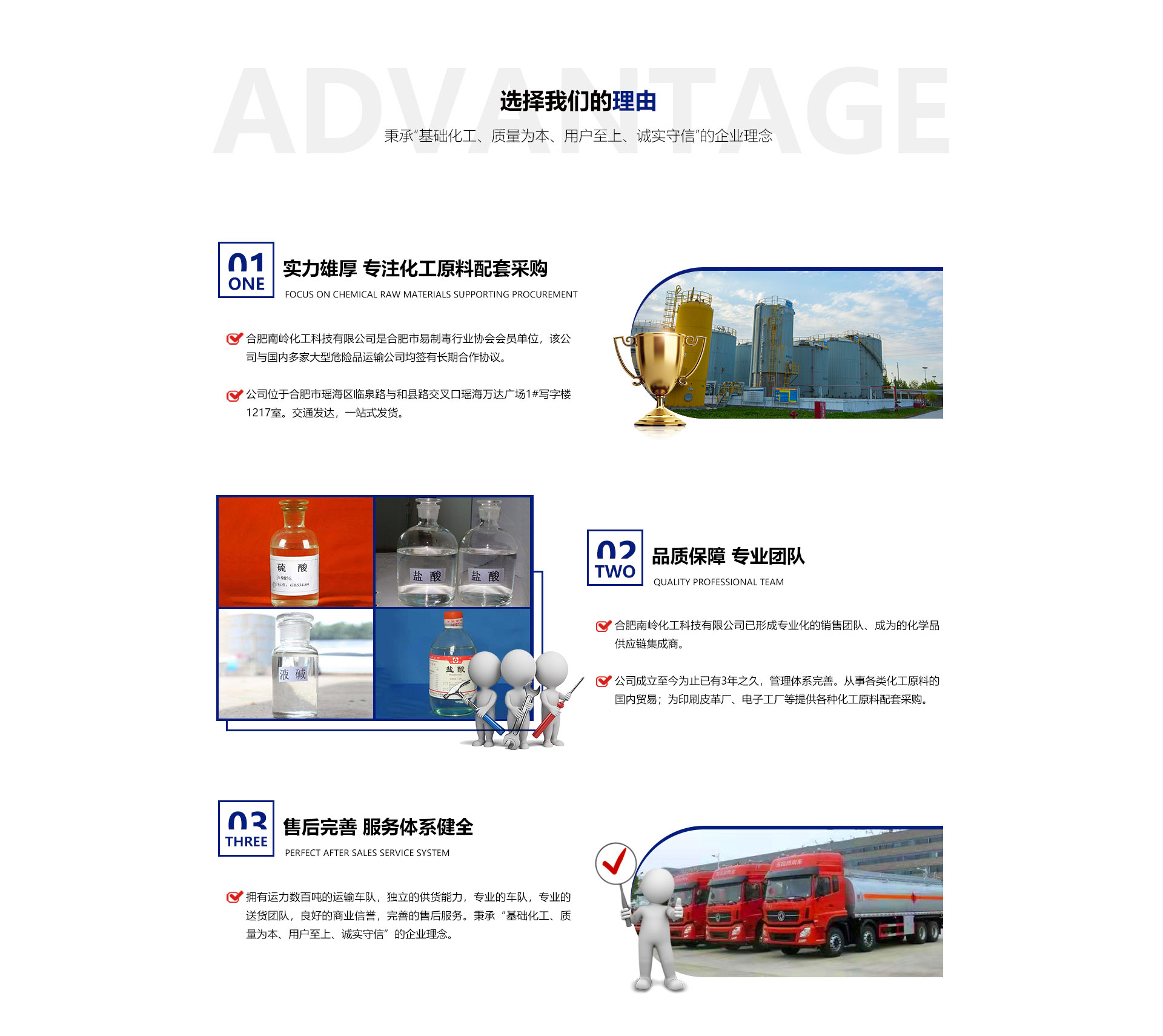 關(guān)于我們合肥南嶺化工科技有限公司是合肥市易制毒行業(yè)協(xié)會(huì)會(huì)員單位,該公司與國(guó)內(nèi)多家大型危險(xiǎn)品運(yùn)輸公司均簽有長(zhǎng)期合作協(xié)議,擁有運(yùn)力數(shù)百?lài)嵉倪\(yùn)輸車(chē)隊(duì),獨(dú)立的供貨能力,良好的車(chē)隊(duì)運(yùn)輸,有效的送貨團(tuán)隊(duì),良好的商業(yè)信譽(yù),完善的售后服務(wù)。秉承“基礎(chǔ)化工、質(zhì)量為本、用戶至上、誠(chéng)實(shí)守信”的企業(yè)理念。從事各類(lèi)化工原料的國(guó)內(nèi)貿(mào)易;為各個(gè)化工廠、印刷皮革廠、電子工廠等提供各種化工原料配套采購(gòu)。目前,公司正朝著以貿(mào)易為基礎(chǔ)、以實(shí)業(yè)為依托,采購(gòu)、銷(xiāo)售,內(nèi)外貿(mào)一體化,上下游一體化,具有綜合增值能力和復(fù)合競(jìng)爭(zhēng)能力化工原料供應(yīng)商。本公司主要經(jīng)營(yíng)的產(chǎn)品有:鹽酸、硫酸、液堿、片堿等。合肥南嶺化工科技有限公司已形成服務(wù),售后一體化的團(tuán)隊(duì)、成為的化學(xué)品供應(yīng)鏈集成商。為客戶提供良好的服務(wù)及產(chǎn)品,本公司經(jīng)銷(xiāo)的各種產(chǎn)品不僅在安徽地區(qū)深受用戶好評(píng),而且具有很高的市場(chǎng)占有率,產(chǎn)品行銷(xiāo)各個(gè)地區(qū)。